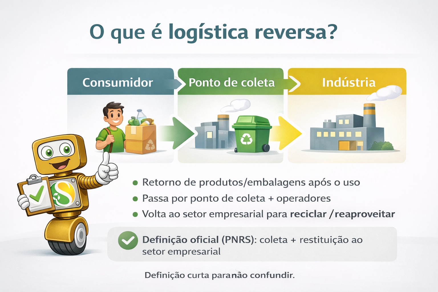 Definição simples: logística reversa é o retorno de produtos e embalagens após o uso, saindo do consumidor (ou da empresa) e voltando, por pontos de coleta e operadores, para a indústria ou para o fabricante, para reaproveitamento, reciclagem ou destinação ambientalmente adequada.