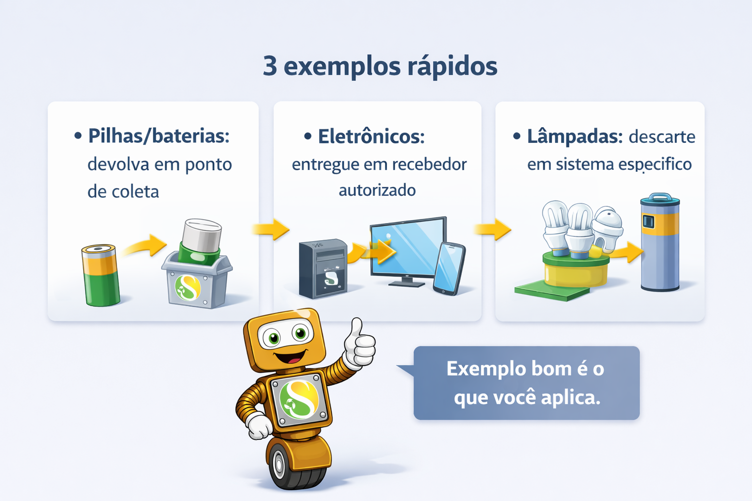 Exemplos comuns: pilhas/baterias, lâmpadas, eletrônicos, pneus e algumas embalagens, quando há sistema de retorno.