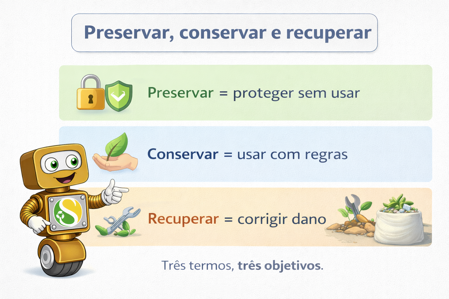 Preservação busca manter intacto (uso mínimo). Conservação permite uso com regras e manejo, mantendo a função do ambiente e evitando degradação.