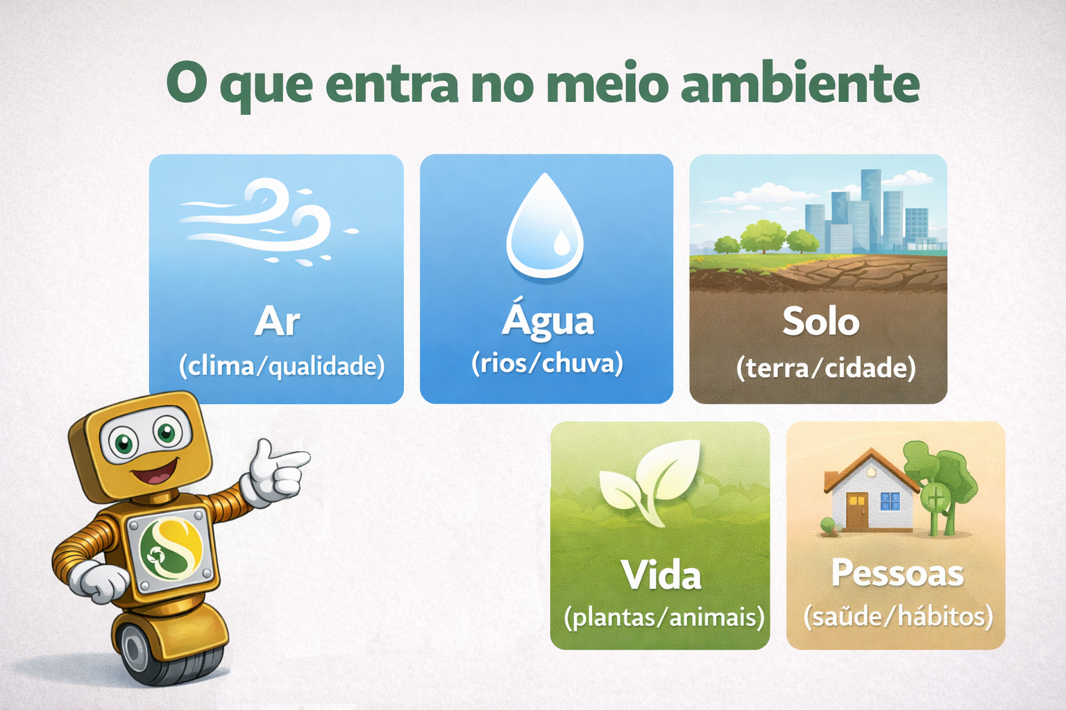 Se você ficar na dúvida, use este teste rápido: “isso influencia ar, água, solo, vida ou saúde/qualidade de vida das pessoas?” Se sim, entra em meio ambiente.