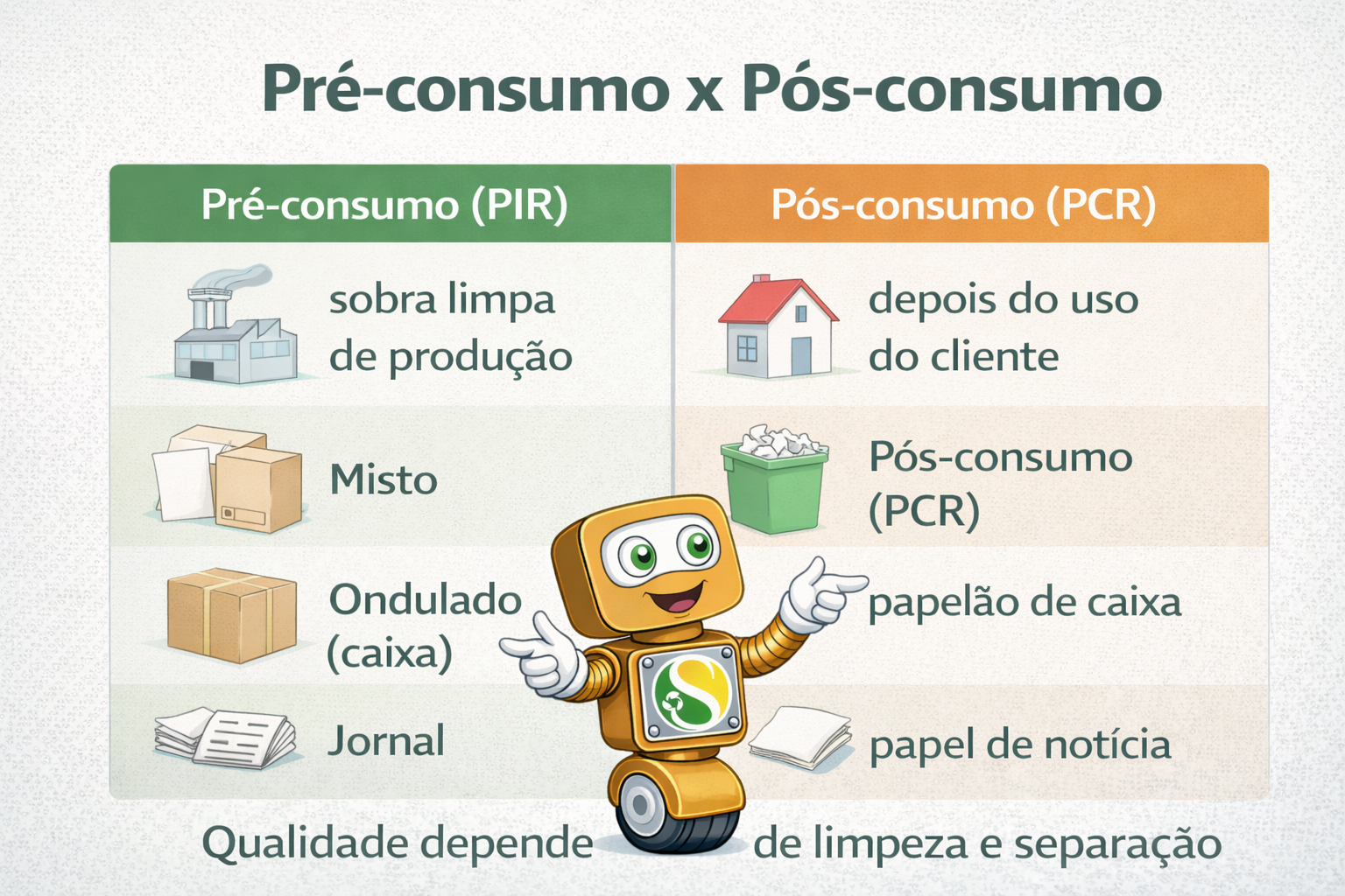 Em geral, pré-consumo é material que sobrou limpo de produção (recortes, aparas de gráfica, sobra de embalagem antes de uso). Pós-consumo é o que já passou pelo cliente: caixa usada, papel de escritório, embalagem que pode ter sujeira.